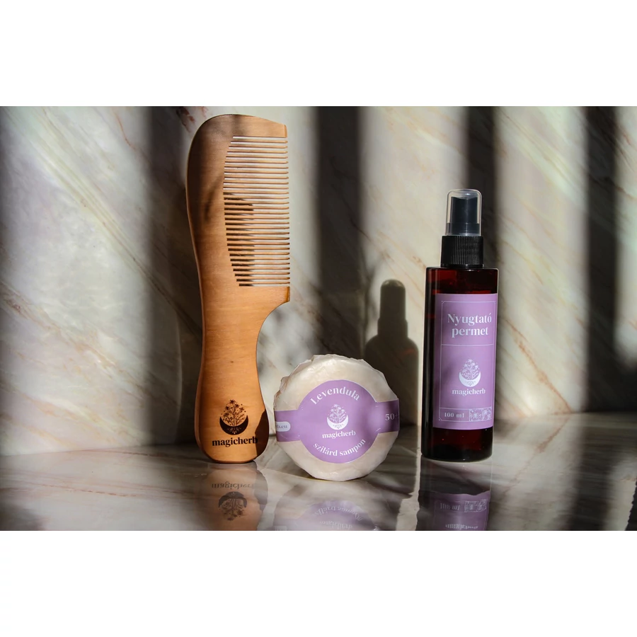 Használata:Mossa meg haját alaposan a Magicherb Levendula szilárd samponnal alaposan majd öblítse le .Ha szükséges akkor használja a Magicherb Hajbalzsamot keratinnal ,melyet szintén le kell öblíteni. Ezután félig törölje szárazra haját majd fújja be fejbőrét alaposan a nyugtató permettel melyet érdemes alaposan bemasszírozni a fejbőrbe.