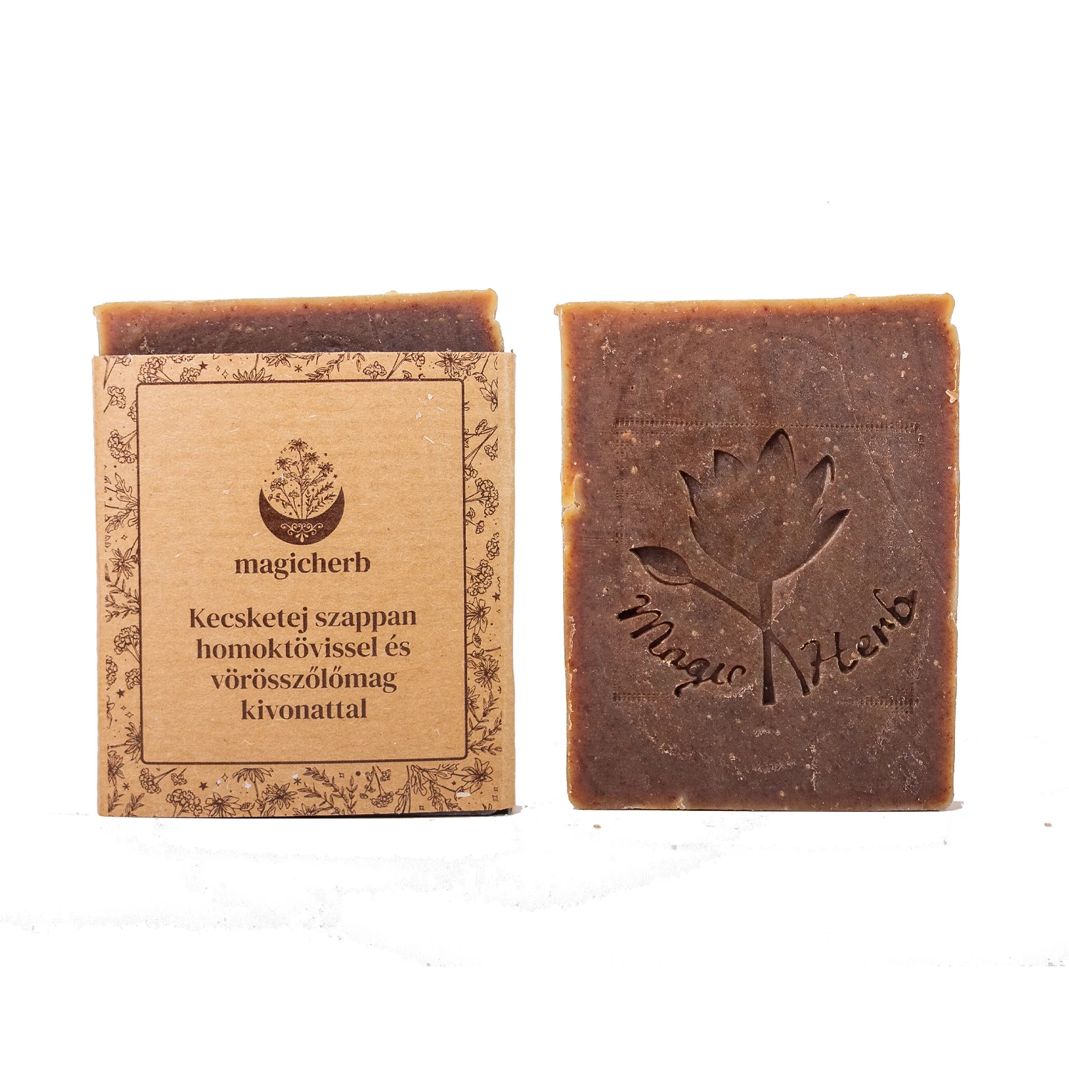 A homoktövis, számtalan jótékony hatása közül kiemelkedik regeneráló hatása, ezért száraz berepedezett bőrre kiválóan alkalmazható ez a szappan. Puhítja, visszaadja a bőr rugalmasságát. A felhasznált szőlőmag liszt és kecsketej minden esetben környezetünk biogazdáitól származnak.