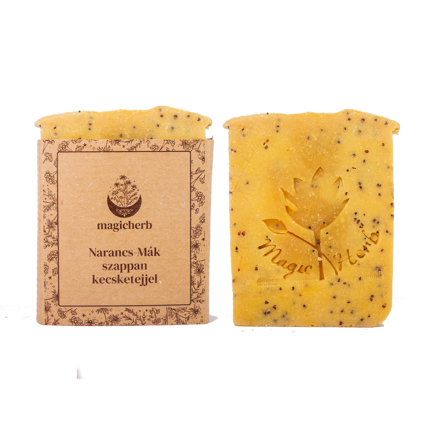 Ingredients: Olea Europea (Olive) oil, Heliantus Annuus oil, Cocos Nucifera (Coconut) oil, Caprae lac, Sodium Hydroxide, Chamomilla Recutita flower extract, Butyrospermum Parkii (Shea) Butter, Ricinus communis seed oil, Citrus Aurantium Dulcis Peel Oil, kurkuma, Papaver Somniferum Seed (mákszem) fragrance