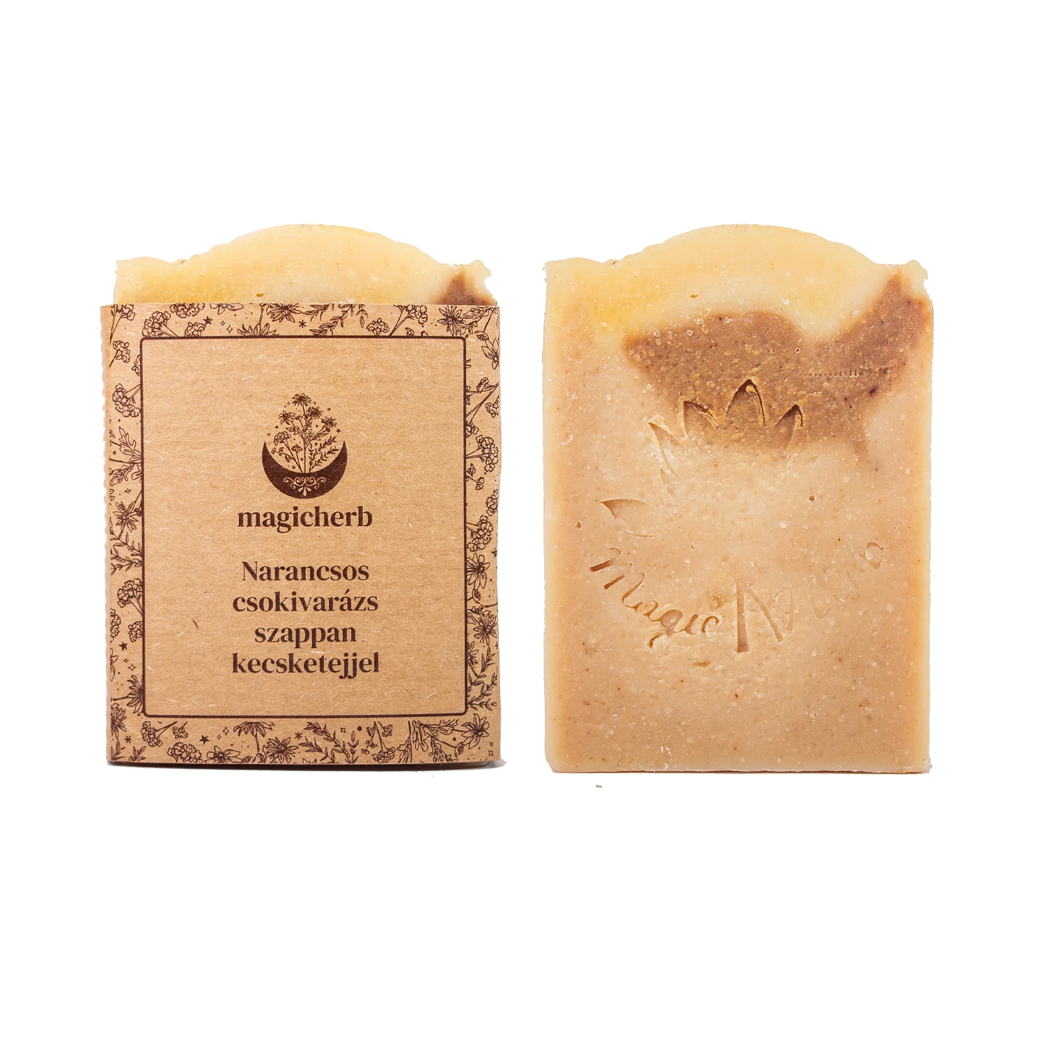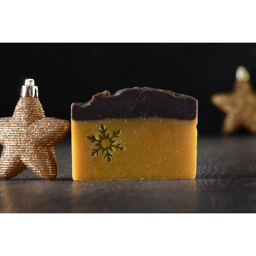 Összetétel: elszappanosított olívaolaj, elszappanosított napraforgóolaj, elszappanosított kókuszolaj, kecsketej, shea vaj, ricinusolaj, kurkuma, organikus kakaó, 100%-os illóolajkeverék